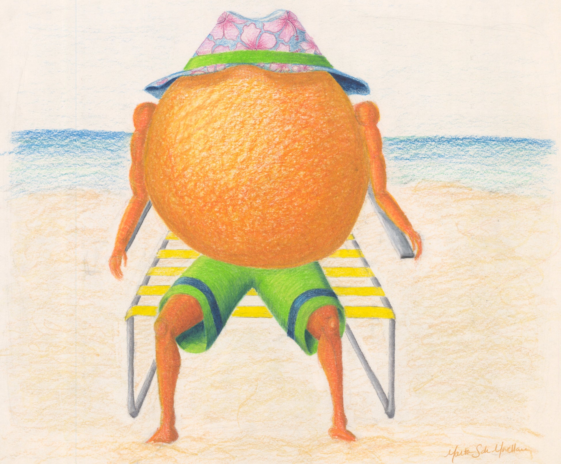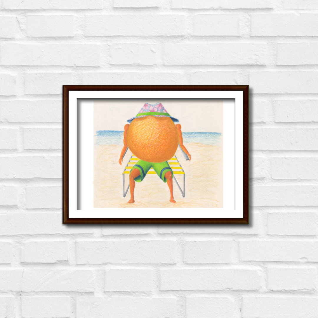 Life is a beach! This fun and playful fine art print of an orange sitting by the ocean is created from an original colored pencil drawing!