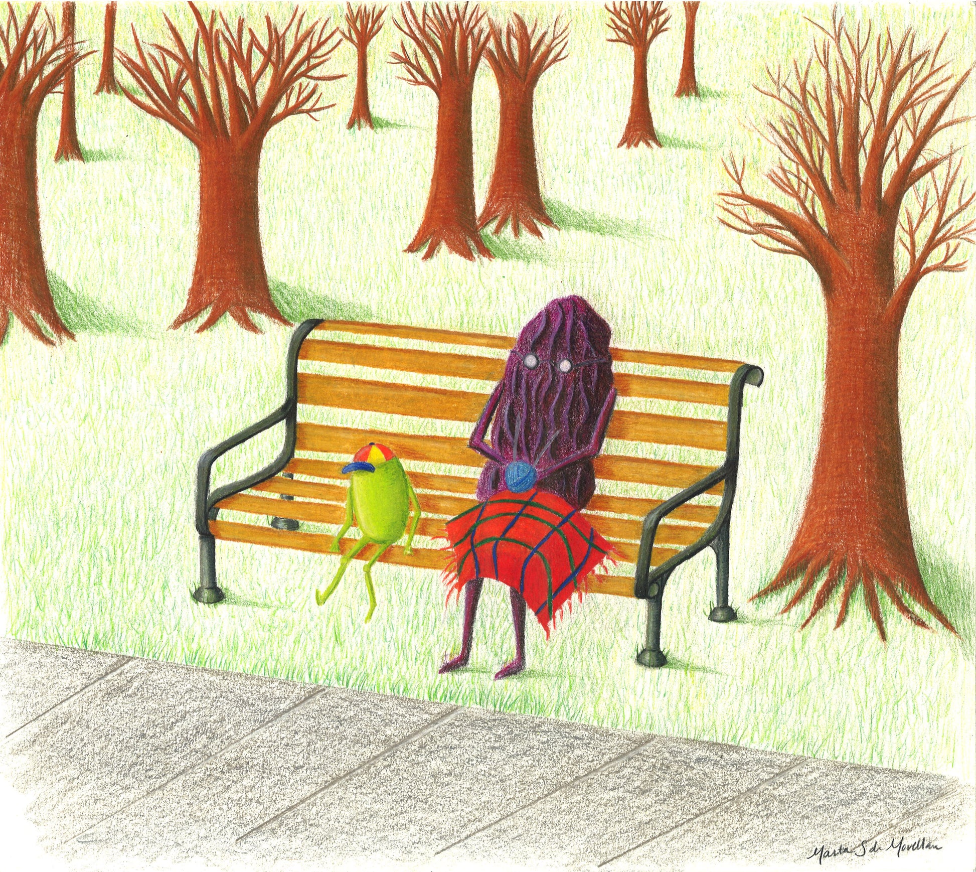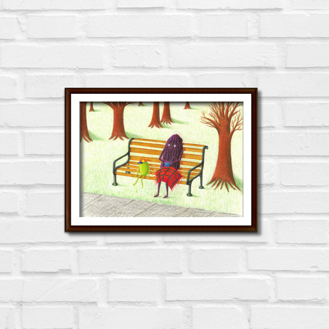 Grandma and grandchild having a day at the park. This fun and playful fine art print of a knitting raisin and a carefree grape is created from an original colored pencil drawing!